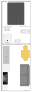 Daar is hij dan, de plattegrond voor de verhuur pipowagen XL. Deze heeft de volgende afmetingen: buitenkant: 840x240 (met veranda) en binnenkant: 714x224. In de afbeelding ziet u de inrichting voor de basis verhuur wagen. De wagen wordt uitgerust met een ruime keuken van 160 cm met inductiekookplaat en koelkast met vriesvak, een groot bed van 160x200cm, ruime bank van 180cm die uitgeklapt kan worden als slaapbank en nog veel meer luxe!